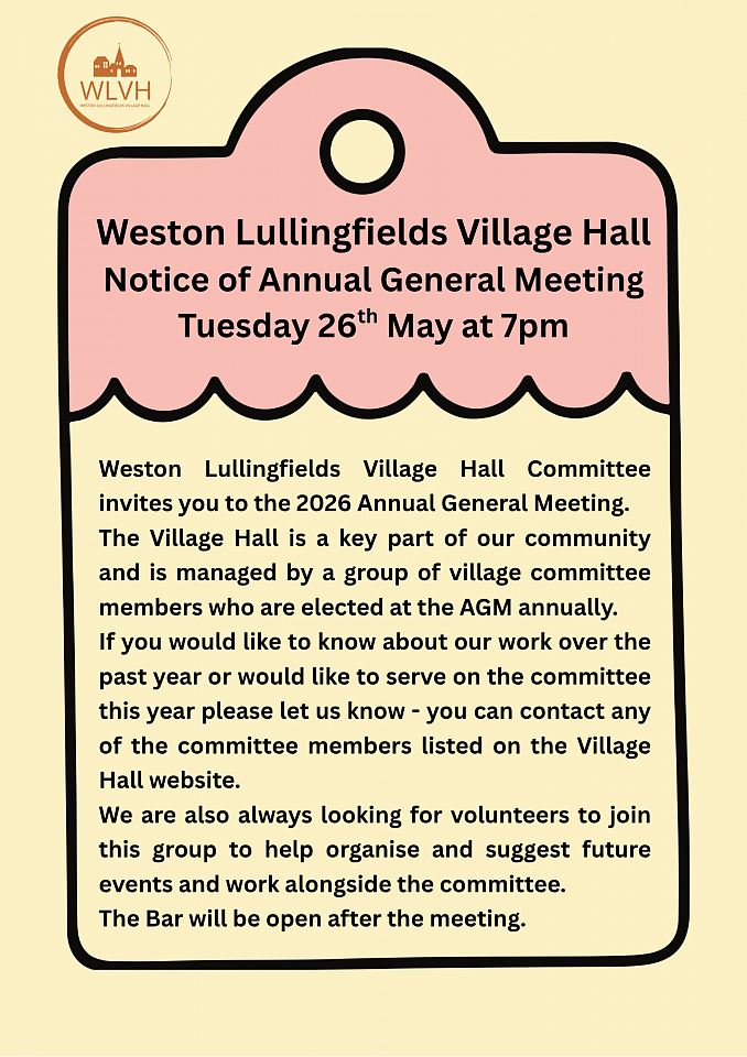Weston Lullingfields Village Hall Committee invites you to the 2026 Annual General Meeting.